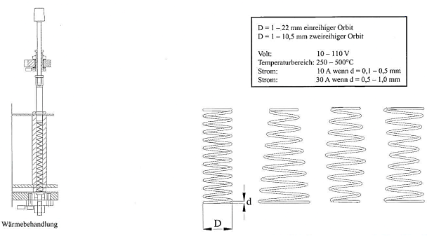 Bei dem patentierten Wärmebehandlungssystem von COLOMBI wird die Feder einzeln kontaktiert. Dadurch ergibt sich eine äußerst gleichmäßige Wärmebehandlung. Das System eignet sich für die gebräuchlichsten Federdrähte als auch für sog. "Musikdrähte".